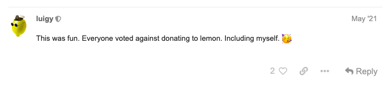 **Disputed proposal:**[ Donate to Lemon Boy](https://forum.1hive.org/t/donate-to-lemon-boy/3416)